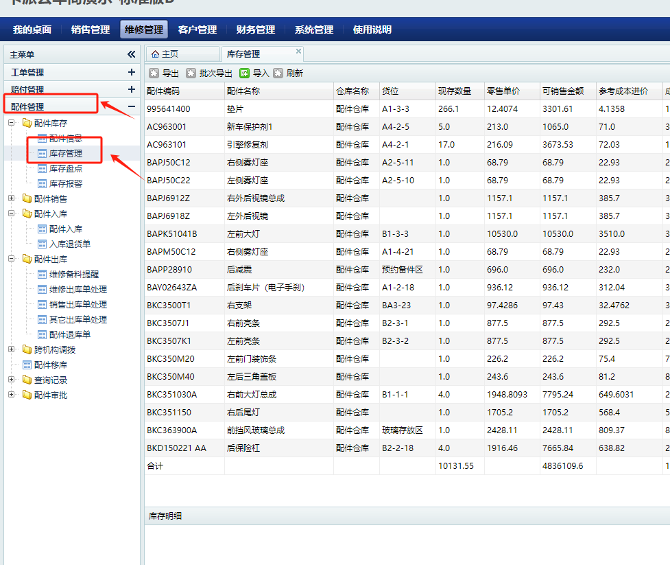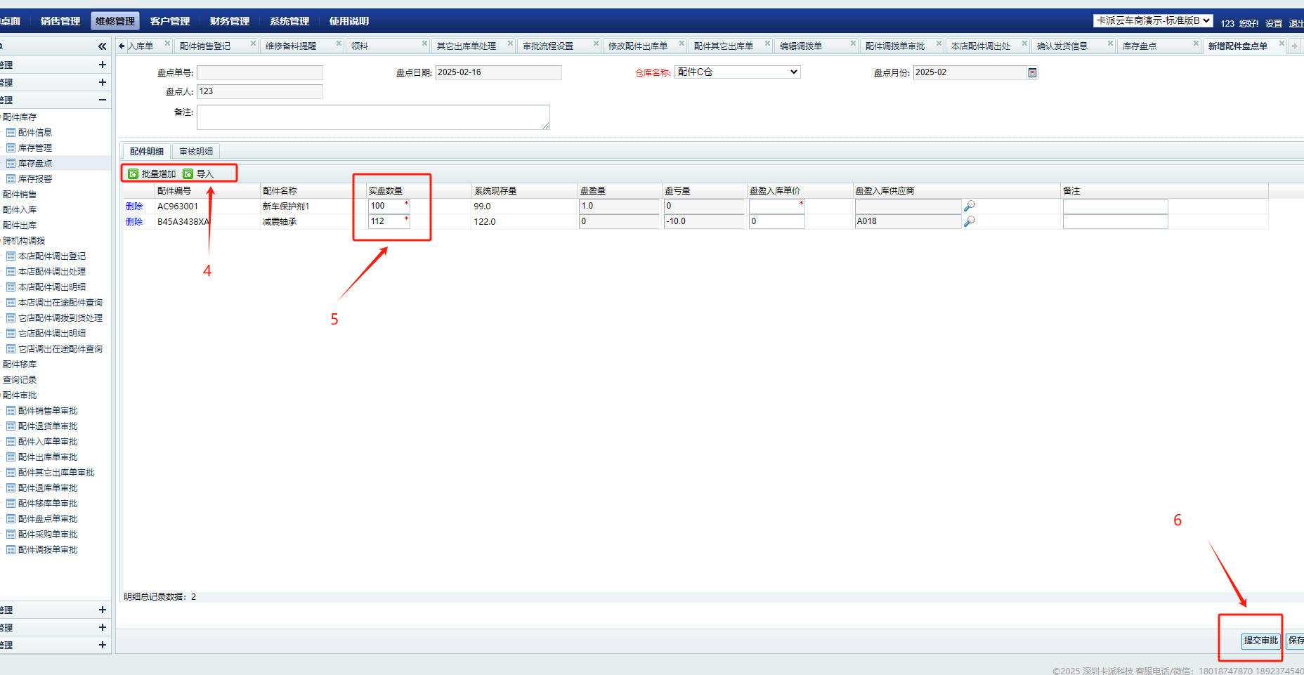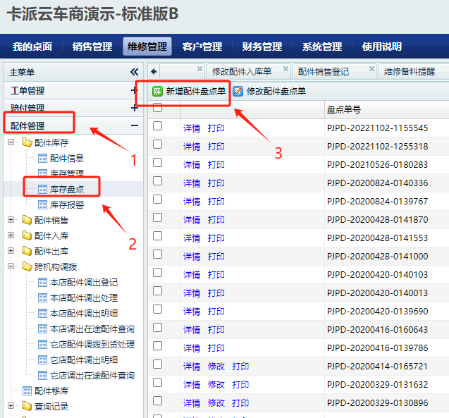 路迳:维修管理→配件管理→配件库存→库存盘点
