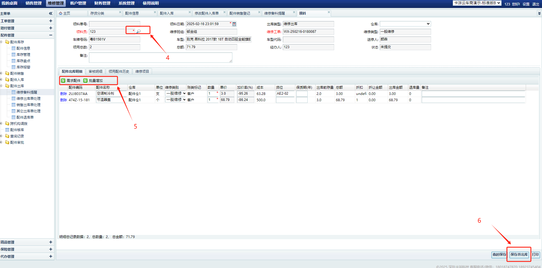 操作:点击菜单进入编辑页面添加完配件后点击右下方的【保存并出库】按钮即可