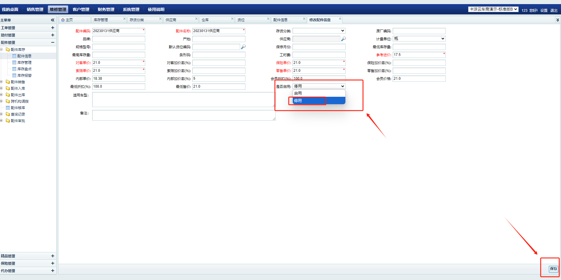 可以在配件信息列表找到对应的配件,点击修改,把【是否启用】字段勾选为【停用】即可