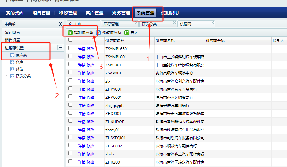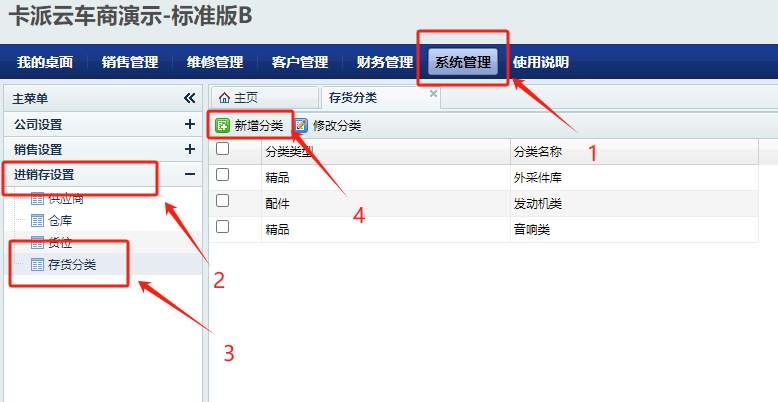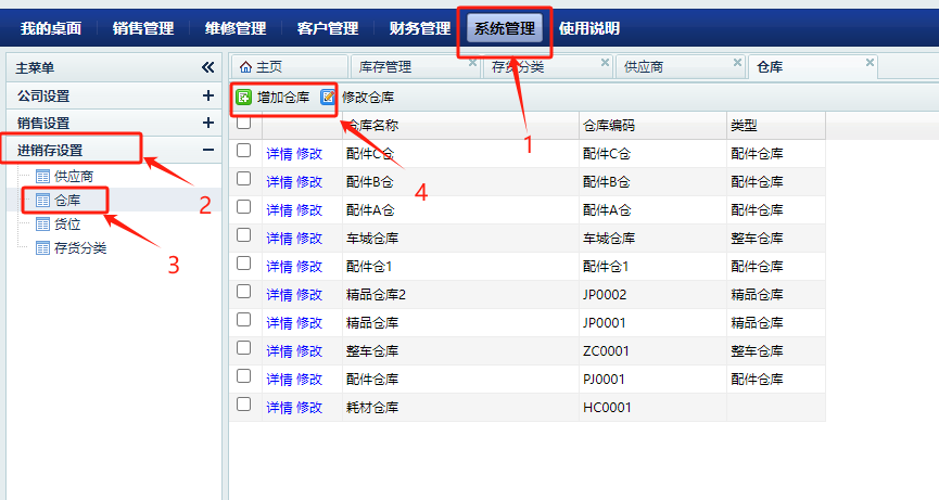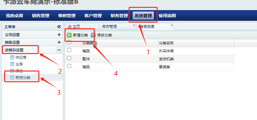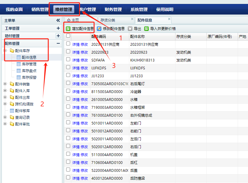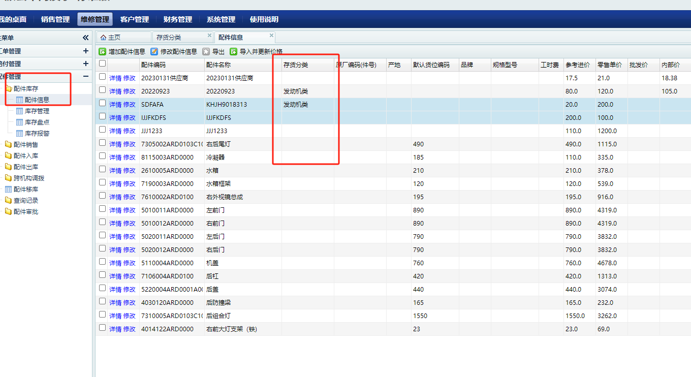 注:配件信息中的“存货分类”可以在【系统管理->存货分类】中新增或修改,存货分类清晰可以方便进行分类统计。