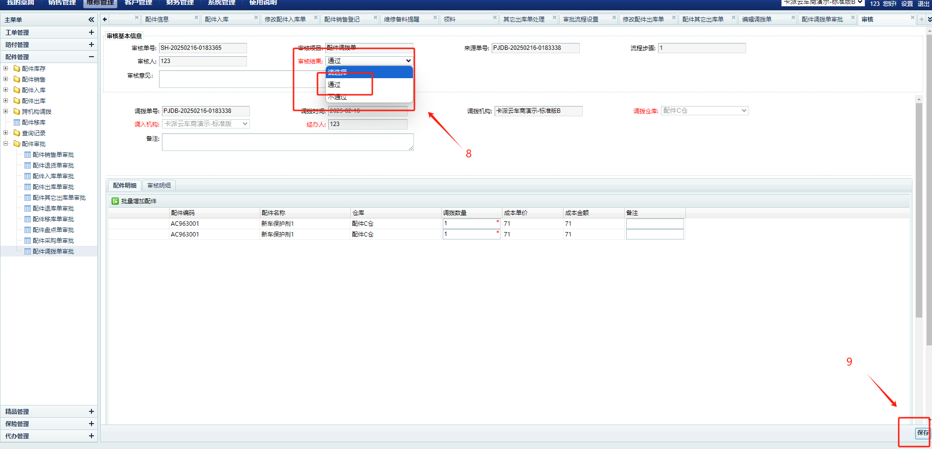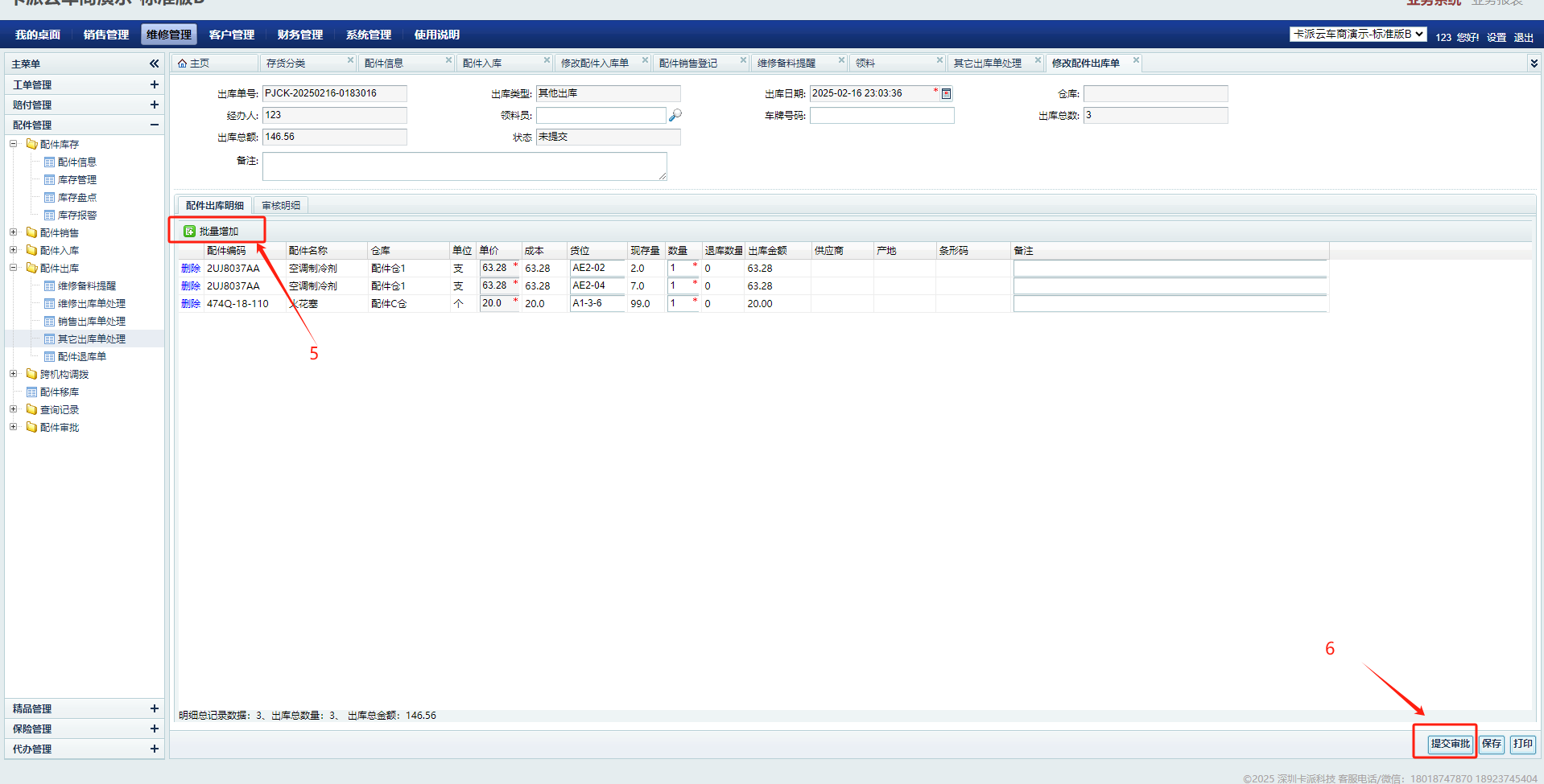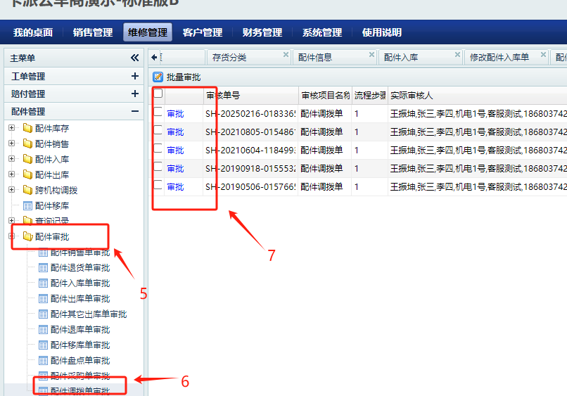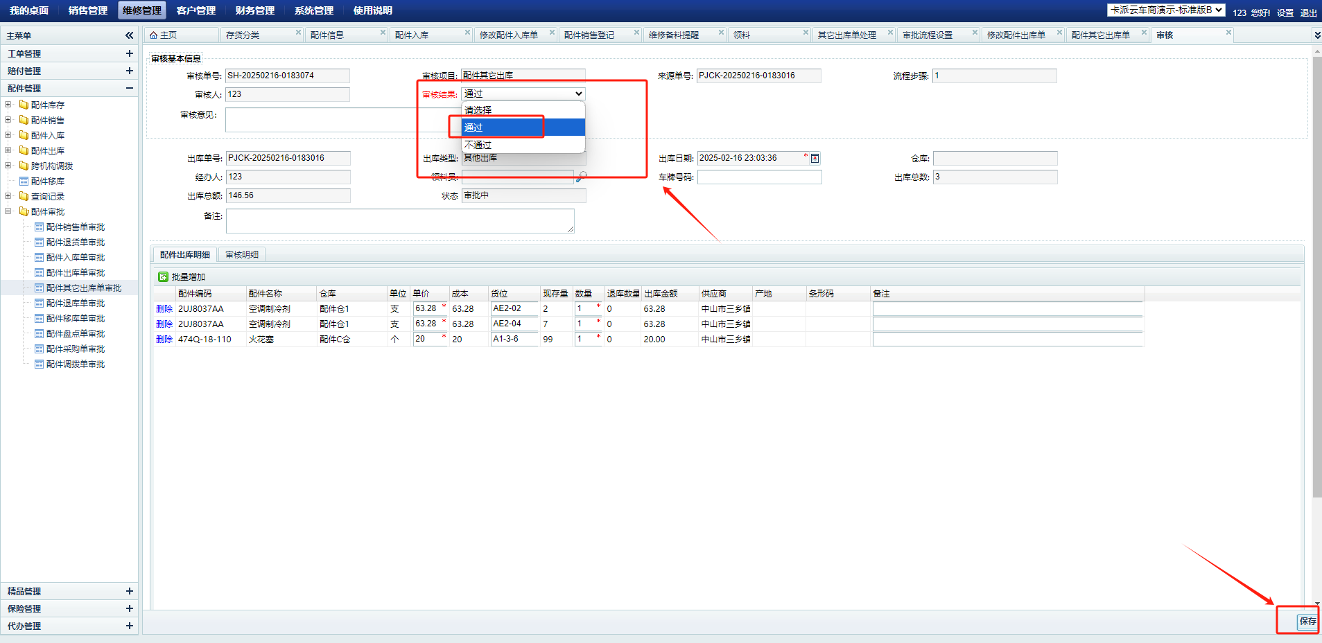 3、审批:流程中配置了审批权限的人员可以在【维修管理->配件管理->配件审批->配件其它出库单审批】中点击“审批”
