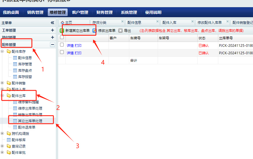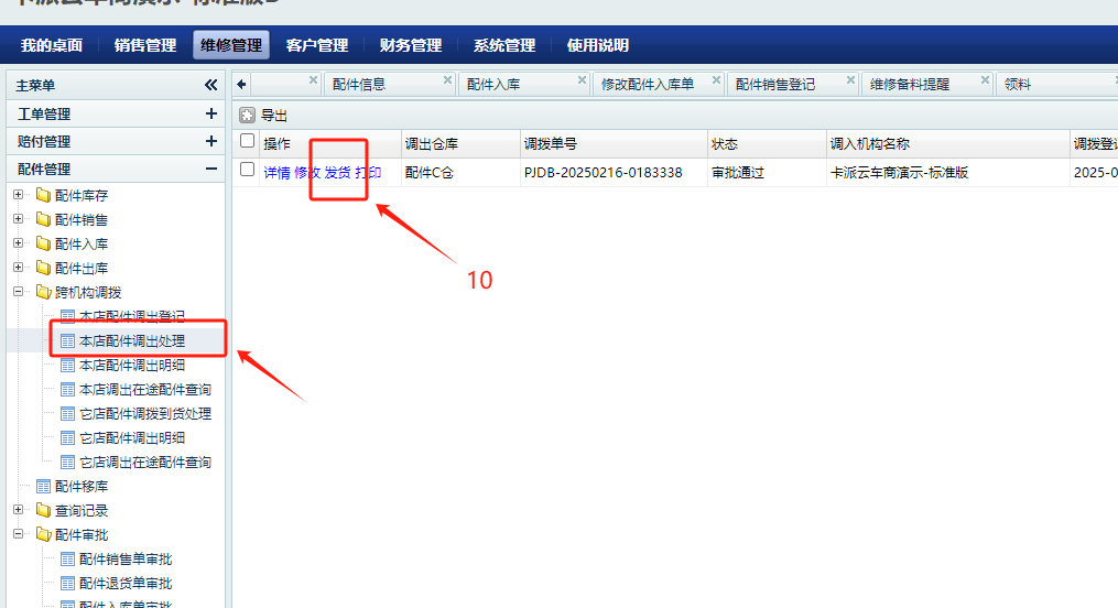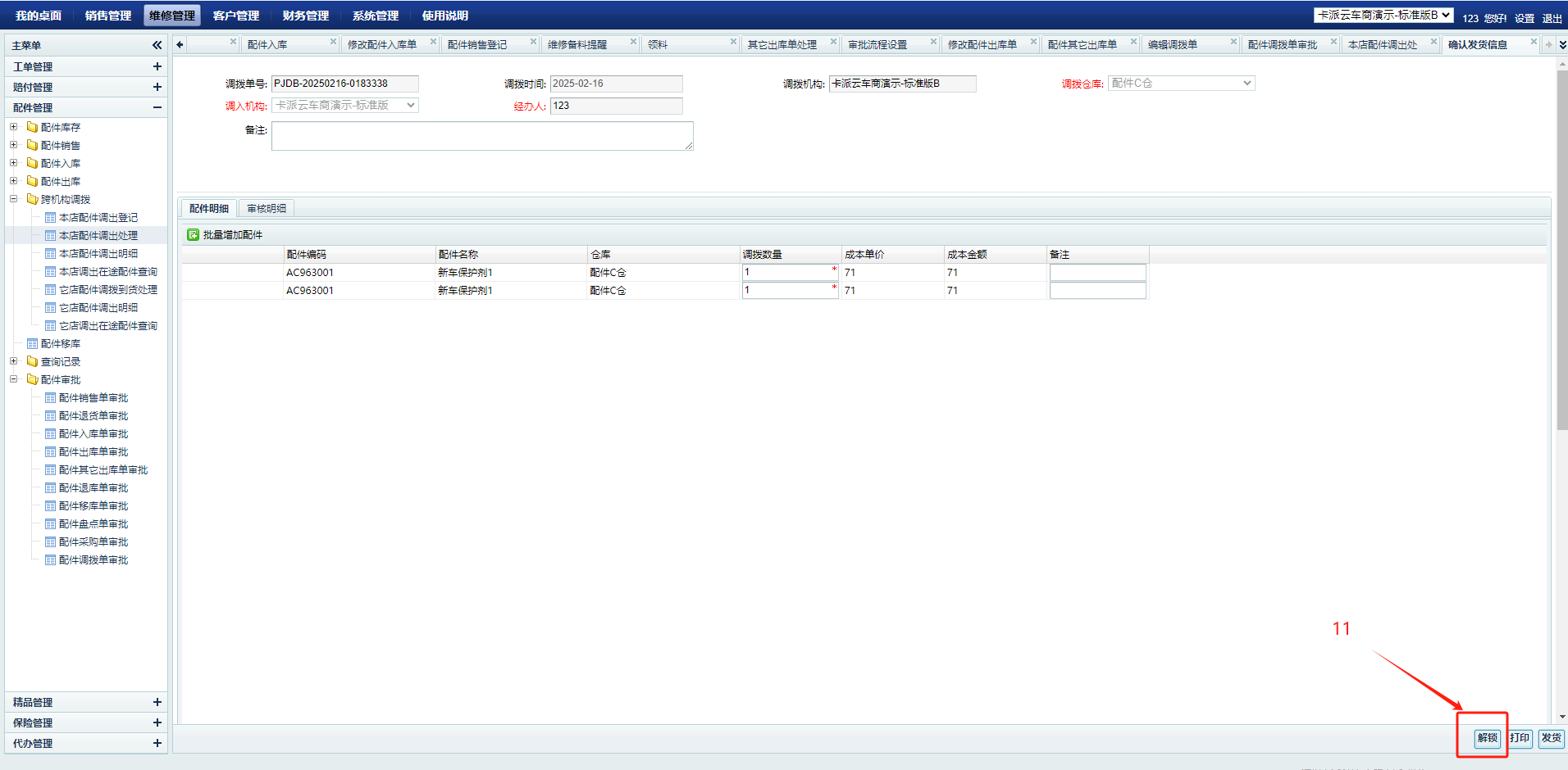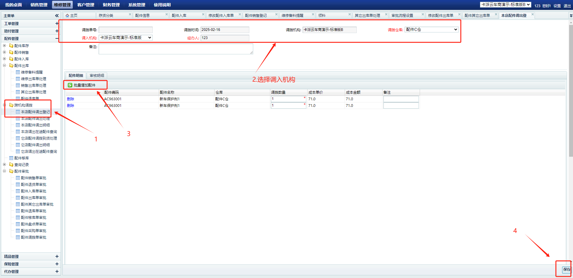 路迳:维修管理→配件管理→跨机构调拨→本店配件调出登记