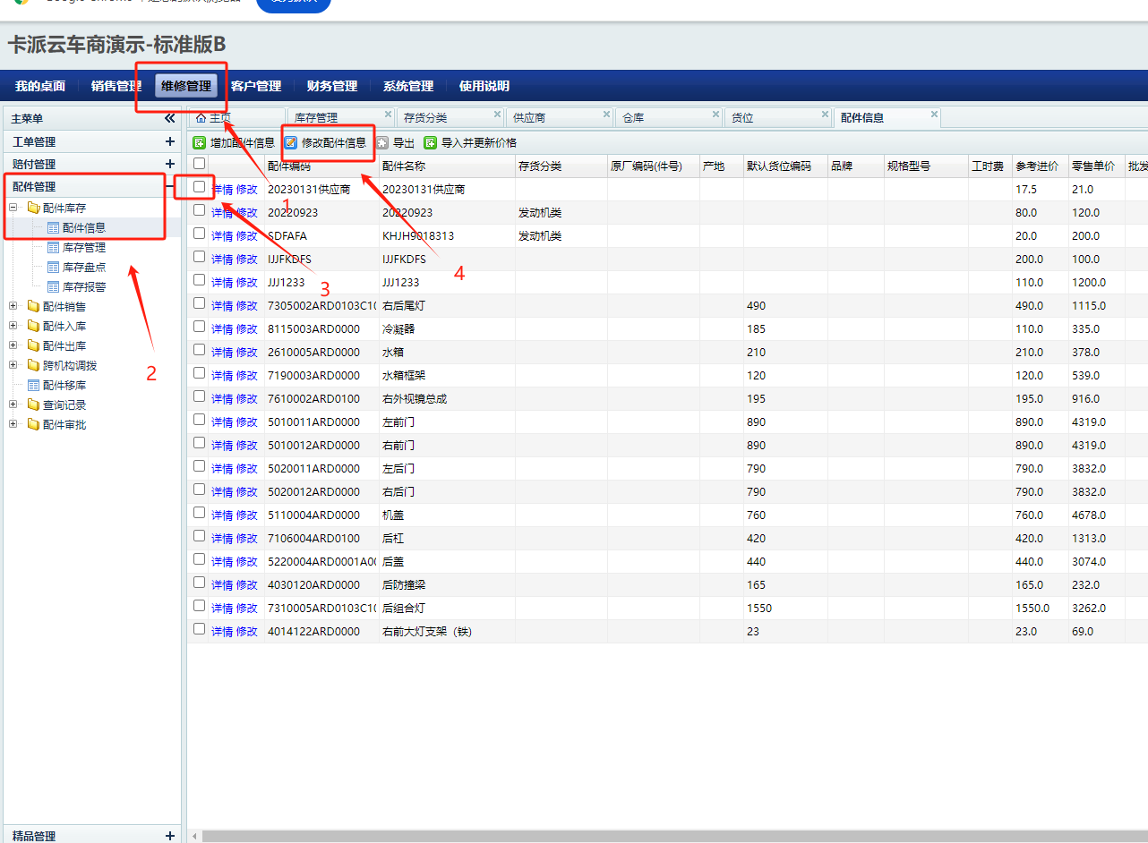 说明:如果打开找不到配件信息,请按第一步的操作方法,先新增配件信息。