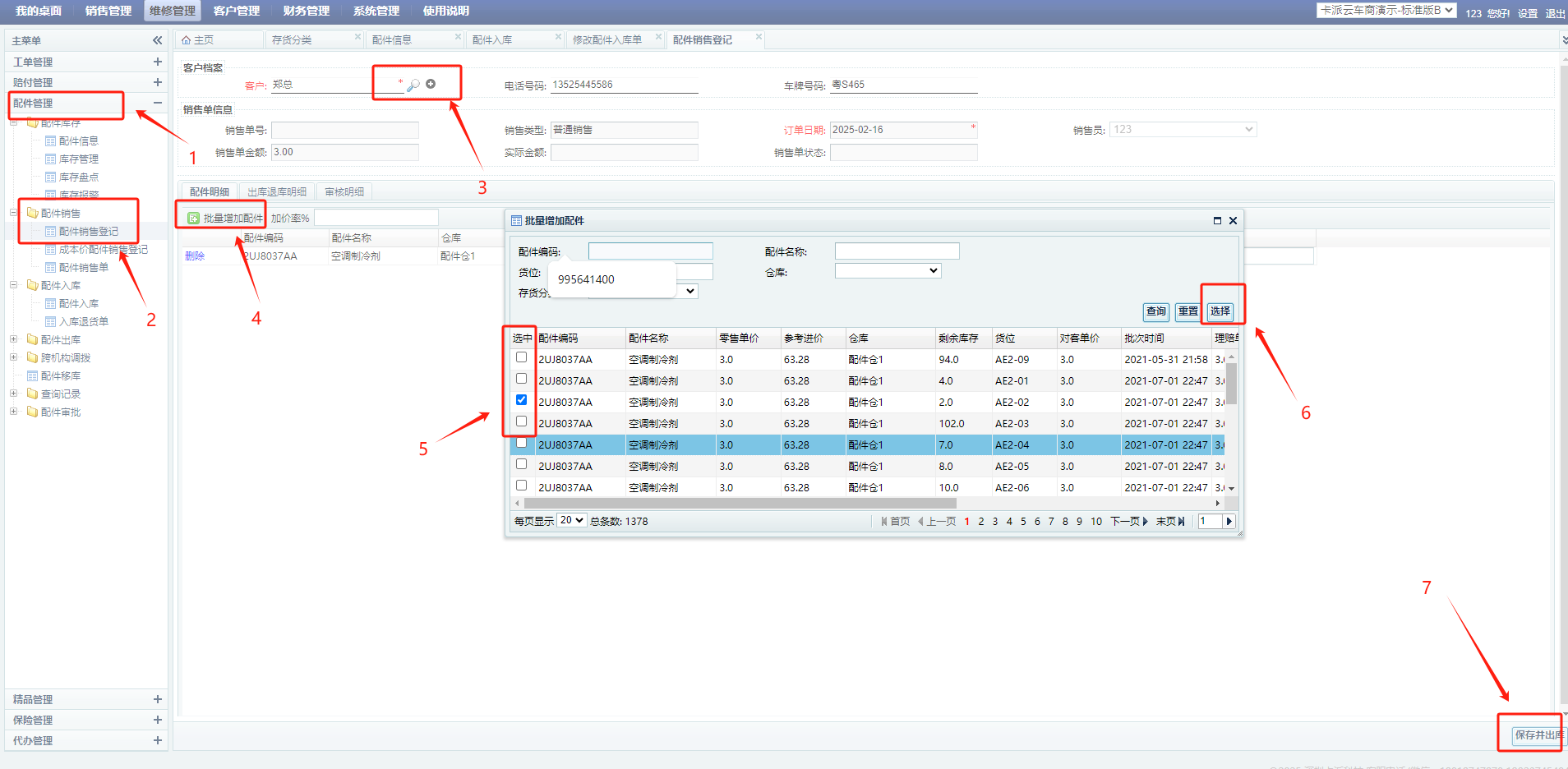 路迳:维修管理→配件管理→配件销售→配件销售登记及成本价配件销售登记