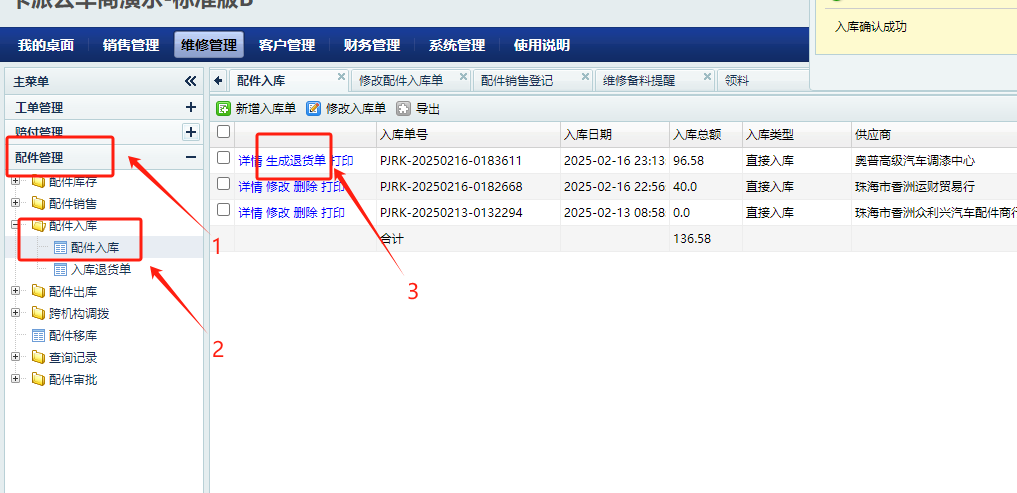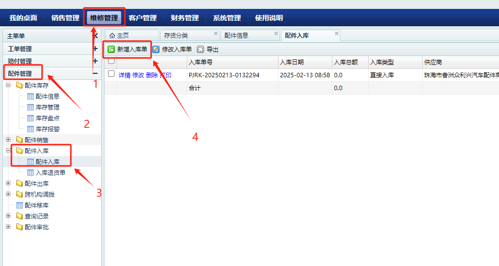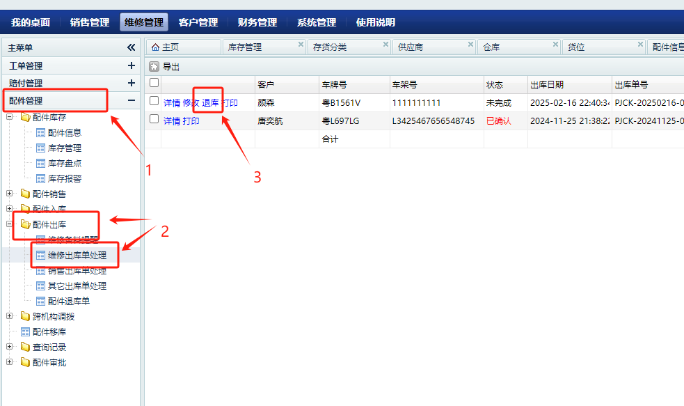 说明:出入库记录在“维修管理→配件管理→查询记录”菜单下可以查看