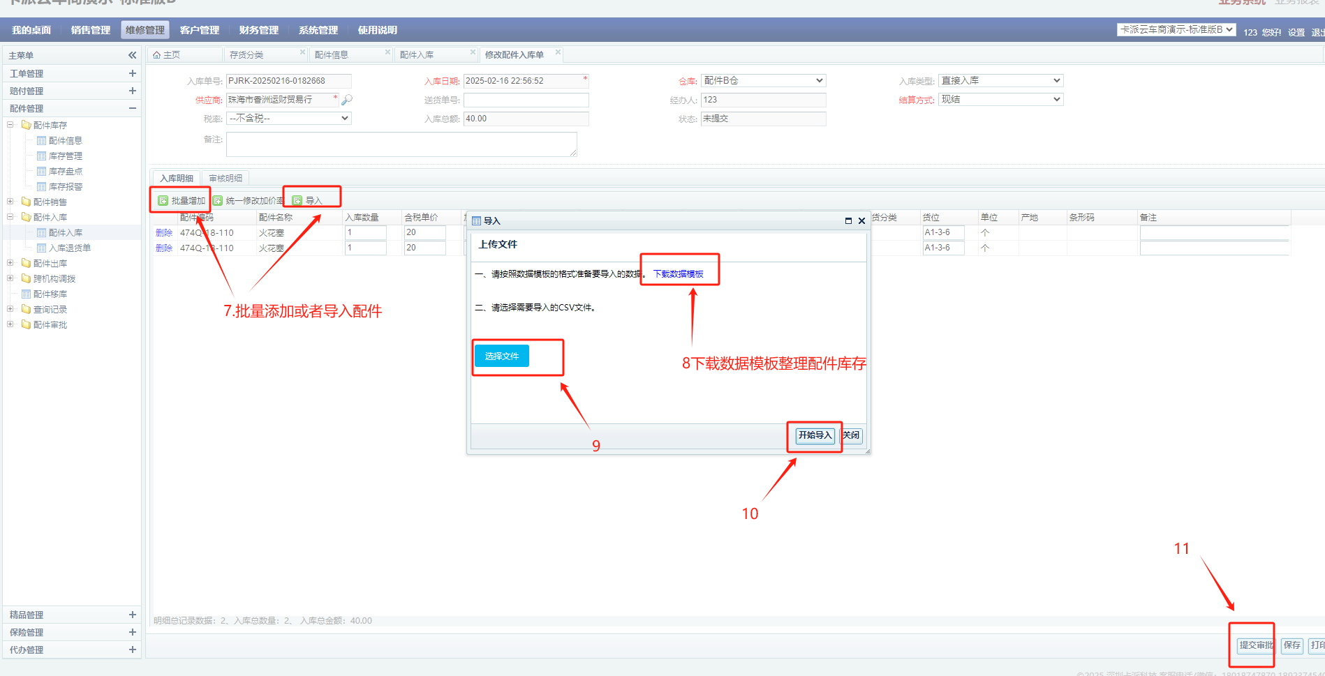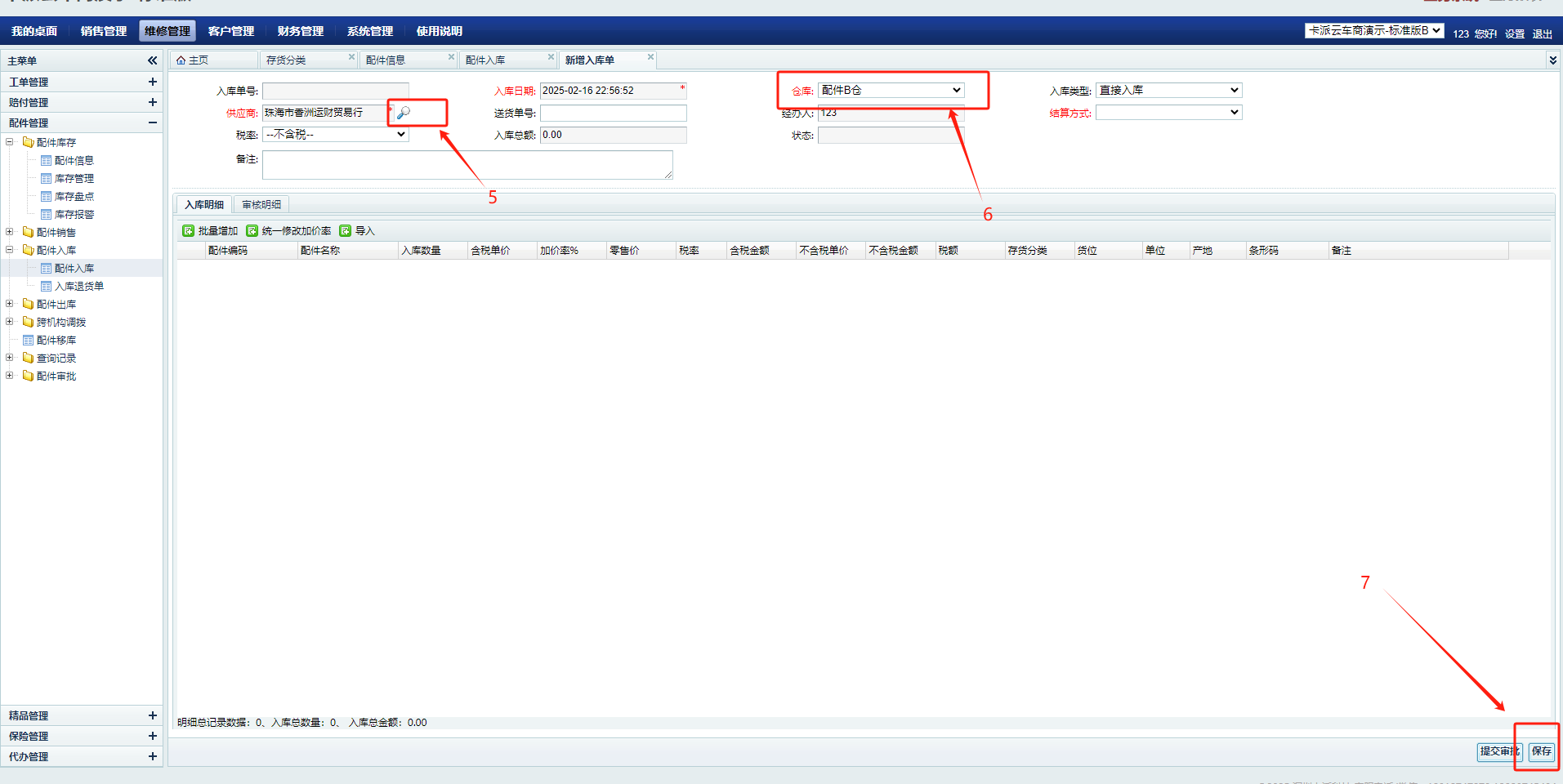 ▲创建配件入库单【需先保存入库单后,才可以添加配件或导入配件】