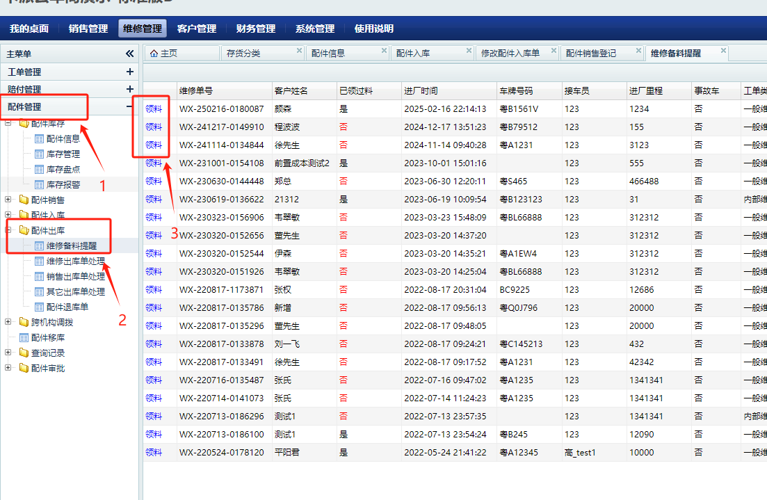 路迳:维修管理→配件管理→配件出库→维修备料提醒
