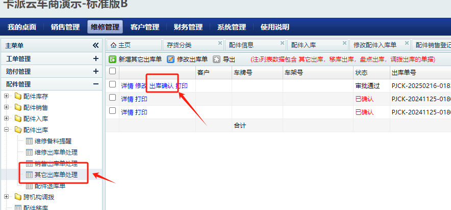 路迳:维修管理→配件管理→配件出库→维修出库单处理