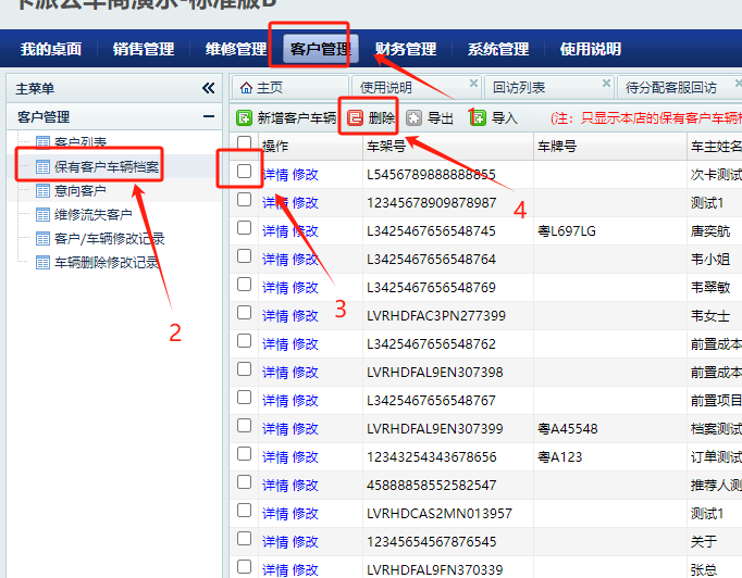 保有客户车辆档案删除只能找本店系统管理员或者集团管理员操作删除。管理员可按如下截图步骤操作