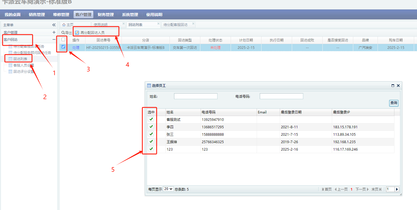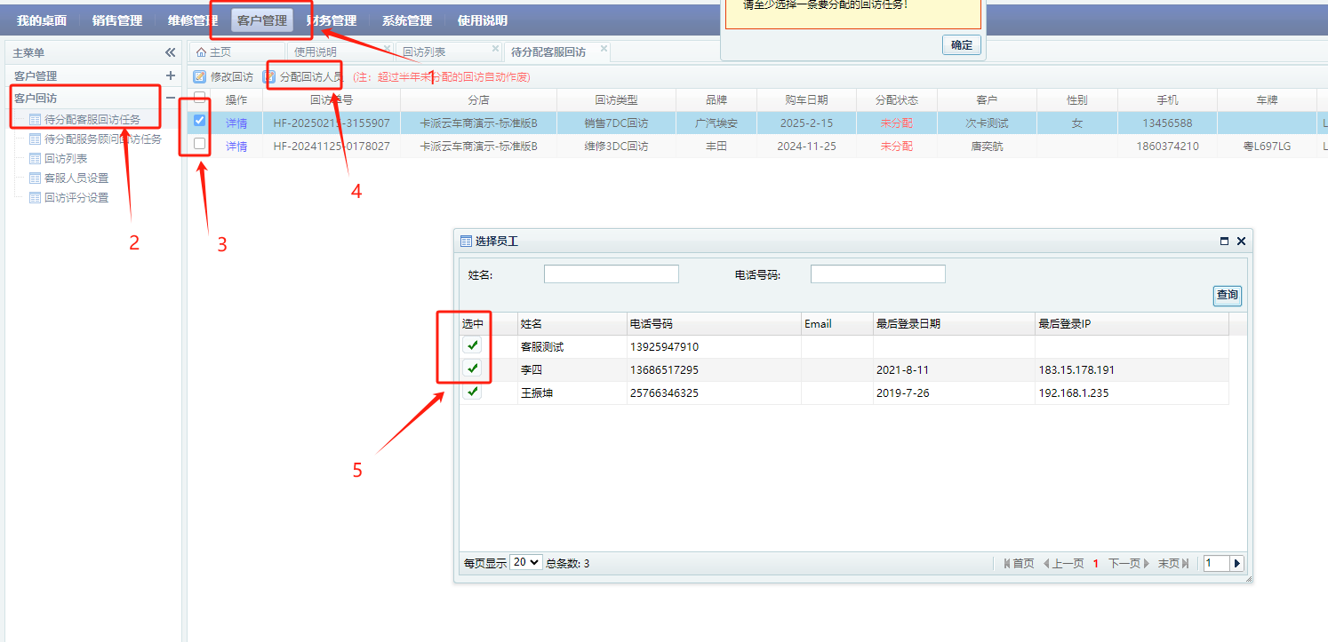 操作:勾选列表左边的选择框(最上方的框为全选),选中后,点击列表上方的【分配回访人员】按钮。