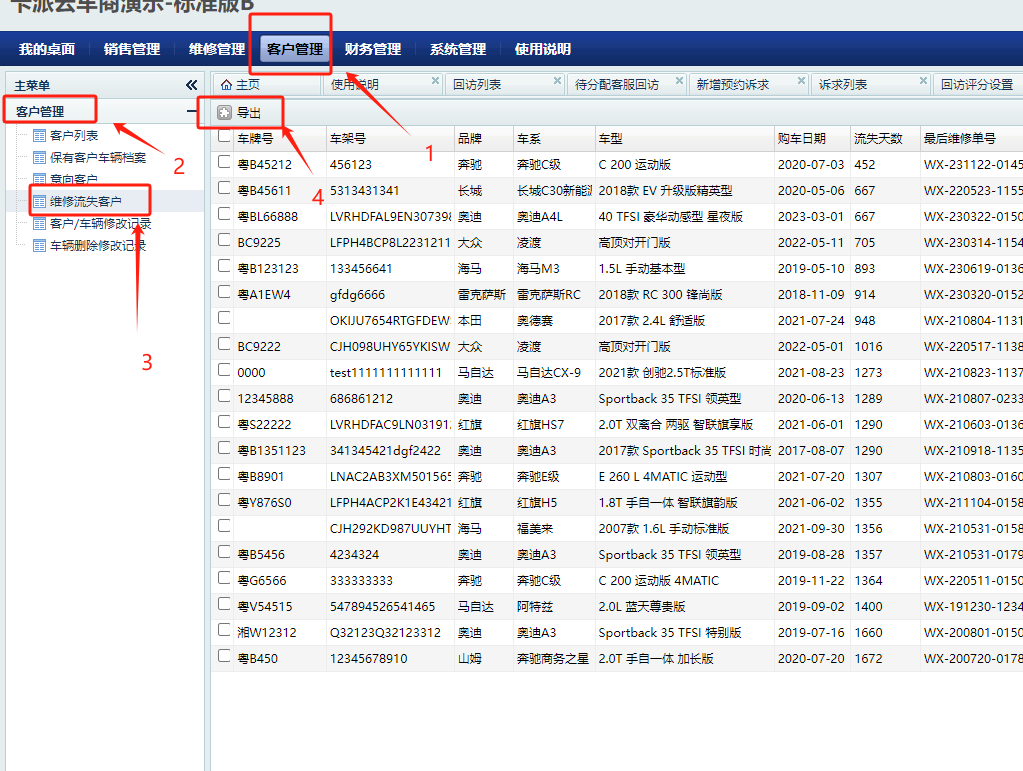 操作:列表下方点击查询条件,点击上方的【导出】按钮可以批量导出流失客户。