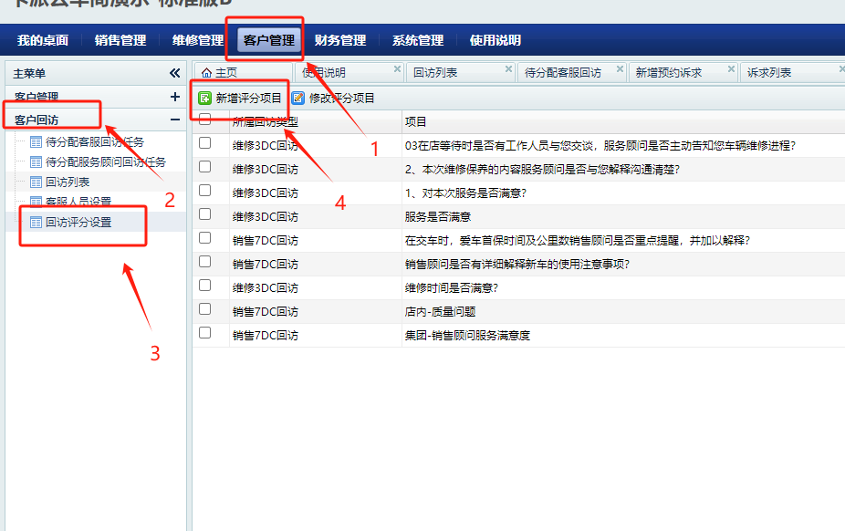 注:回访时的问题项目可以在系统设置下进行配置和修改