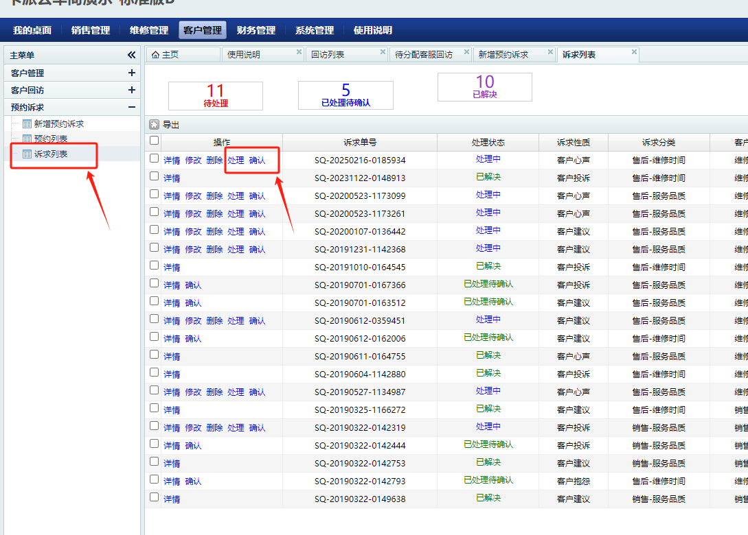 注:诉求的操作流程为:客服专员新增诉求并分配处理人→处理人处理完成后并提交完成确认→客户专员确认诉求是否完成,再点完成后结束,如果客户专员发现没有处理完成,可以再次分配处理人。
