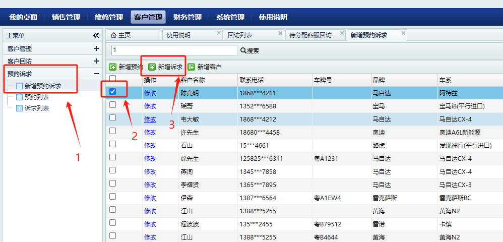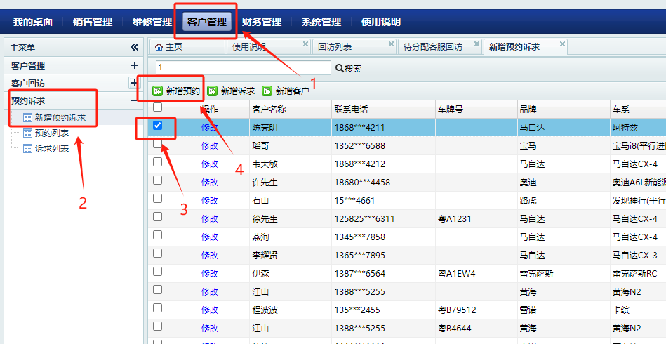 1 | 分配回访任务、回访、新增预约、新增诉求 |