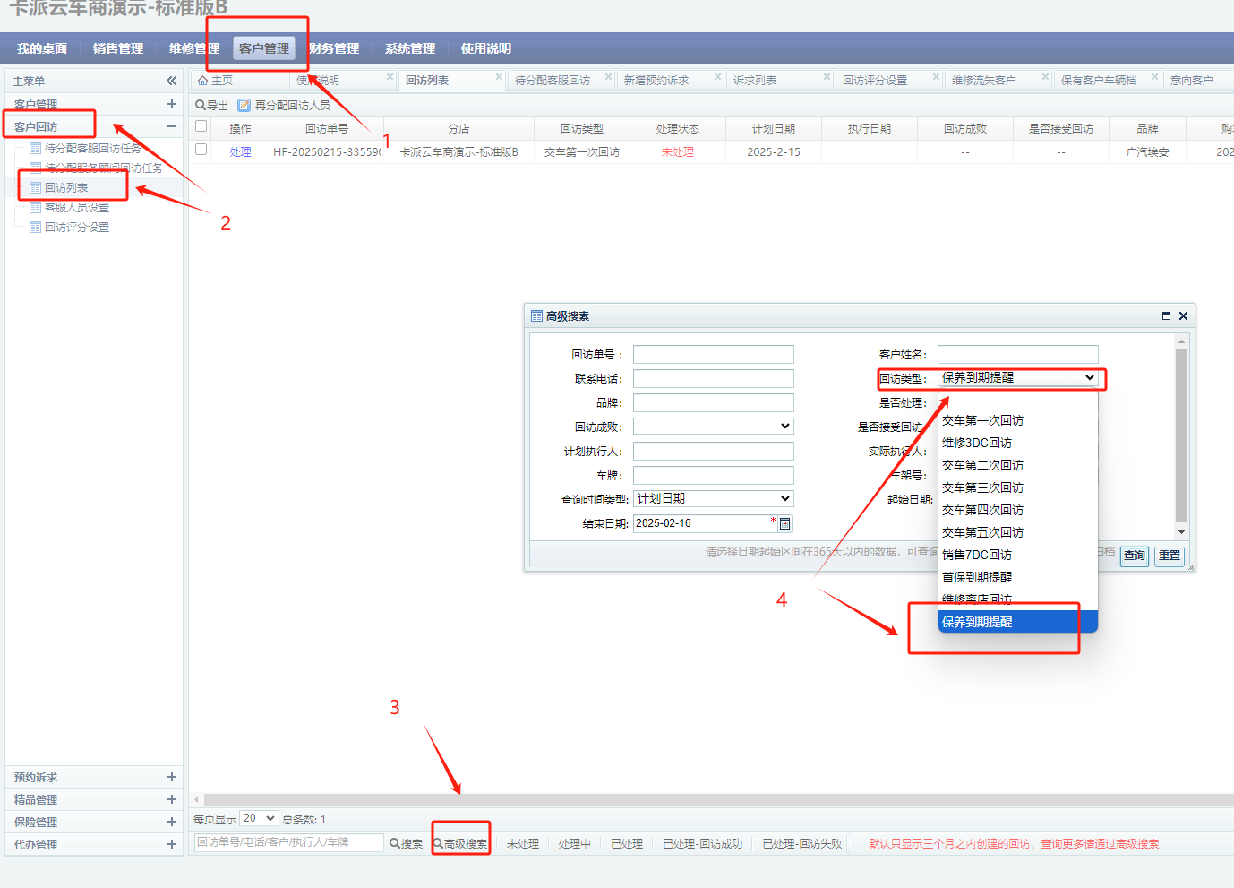 在客户管理—回访列表—高级搜索可以按照回访类型是【保养到期回访】的查询客户回访单并导出