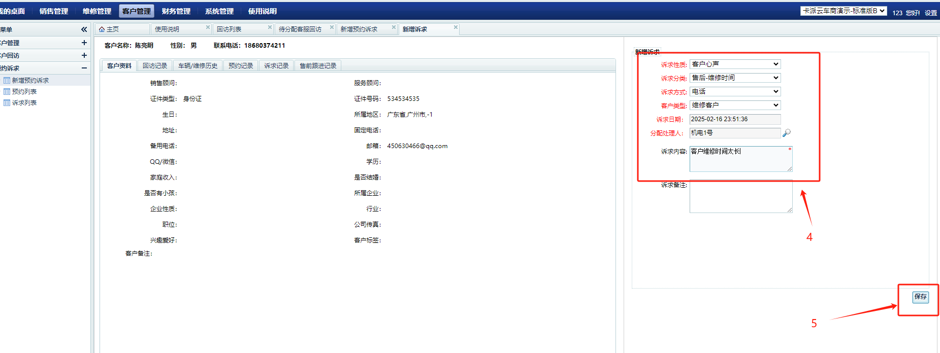 操作:首先在列表上方搜索系统有已有的客户资料(如果没有找到客户资料,需要在:客户管理→客户管理→保有客户菜单下“新增客户”),找到客户后,选中该客户,点击列表上方的【新增诉求】按钮,进入编辑页,登录完成后,点右下角的【保存】按钮。