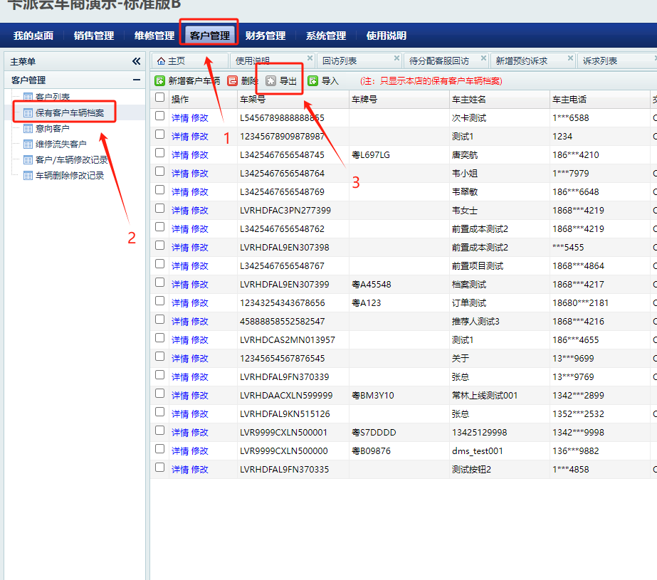 1 | 保有客户车辆档案重复了如何删除、如何查询售后车辆档案修改记录、如何导出保有客户车辆档案 |
