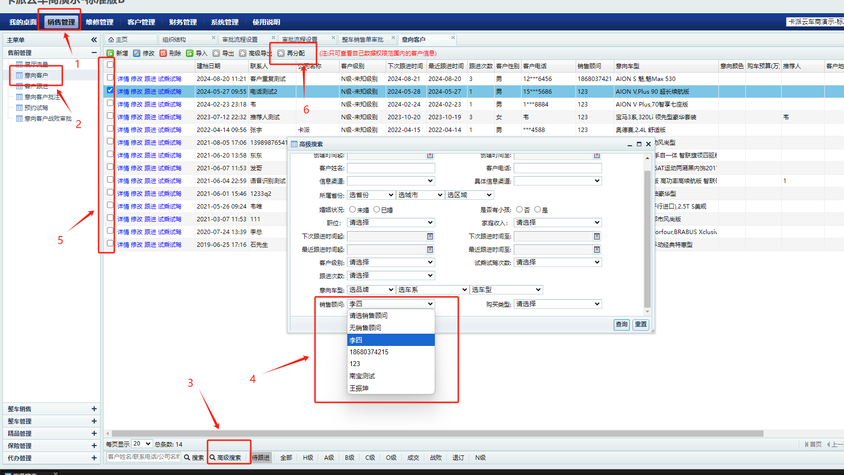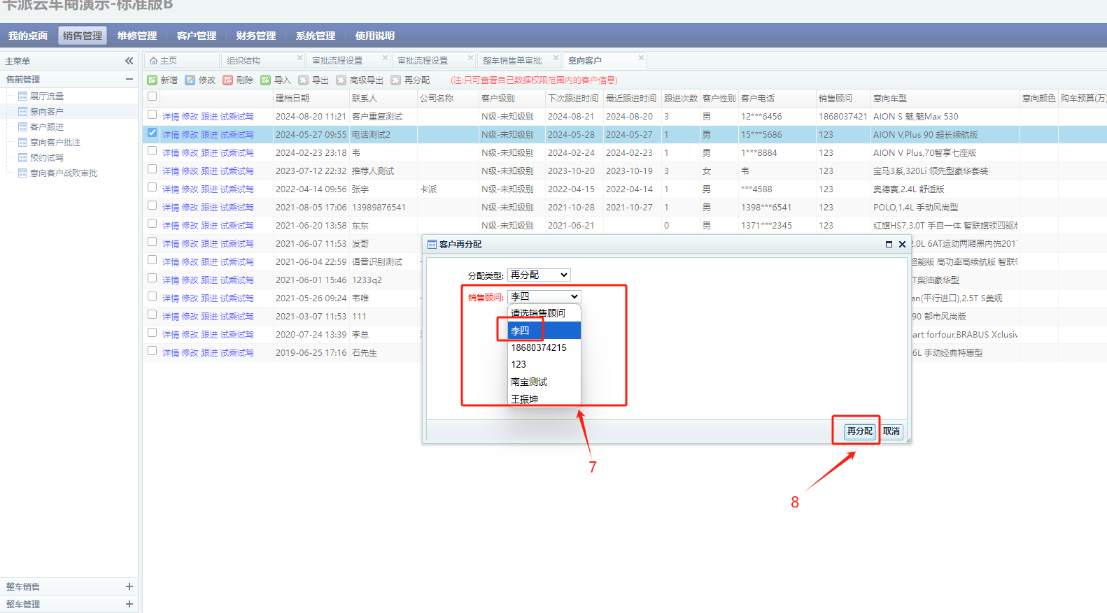 操作:①在列表中找到客户并勾选,点击上方工具栏中的“再分配”按钮。②在下方工具栏中点高级搜索,选择销售顾问的名字(此处可以多条件组合查询),点击查询,就能查看到该员工名下的客户,勾选好这些客户,点击上方工具栏中的“再分配”按钮,分配给其它销售顾问。