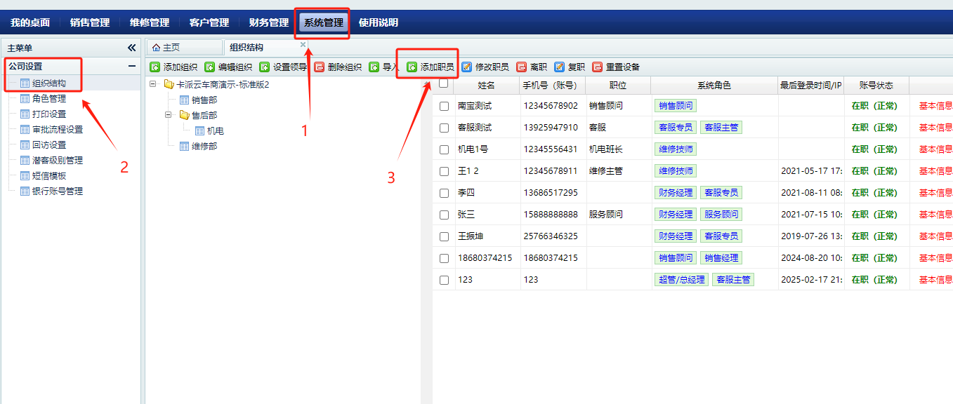 操作:点击上方菜单栏的“添加职员”按钮,在弹开的页面上输入员工的手机号、姓名、密码(此处的密码为设置的初始密码,建议用此员工的手机号加一个小写的字母,例如13800000000k);选择该员工的系统角色,例如:销售顾问,销售经理,收银员等;填写完相关信息后,点击右下角的“保存”按钮。