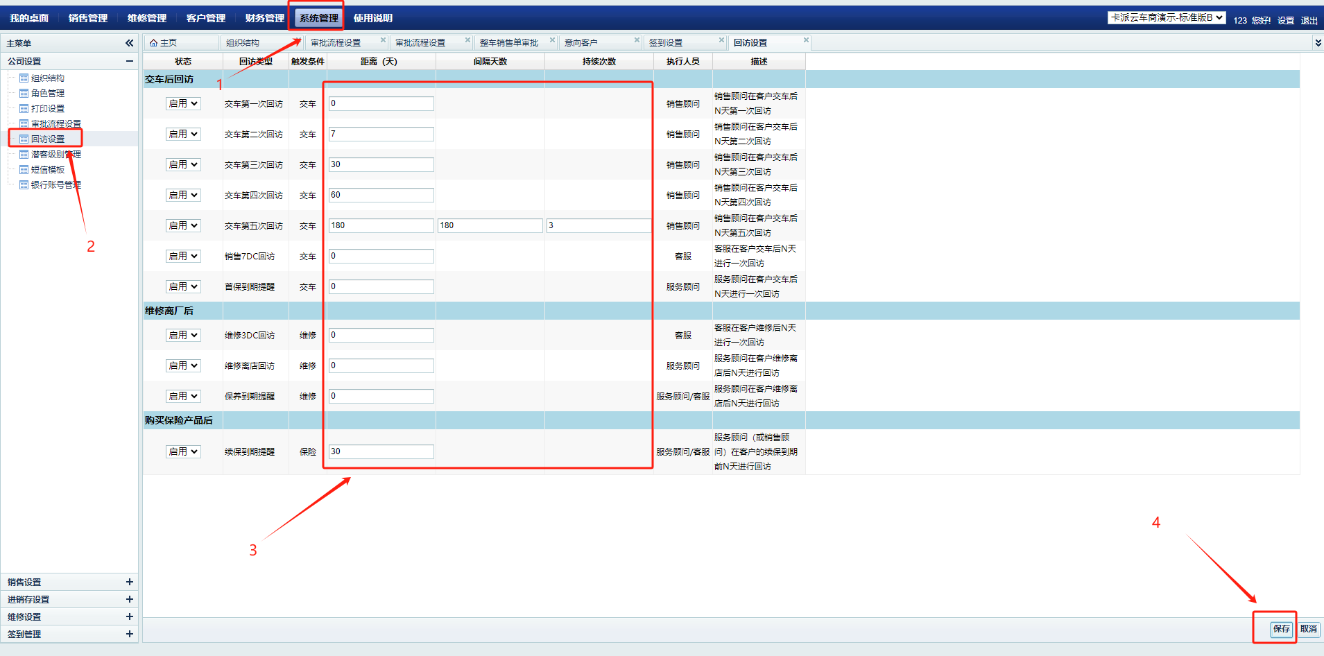 操作:在状态栏,可下拉选择启用或停用,在距离(天)栏,填写好客户交车后第几天后回访,点击确定,保有客户回访次数没有任何限制,在持续次数选框中加上需要回访次数即可。