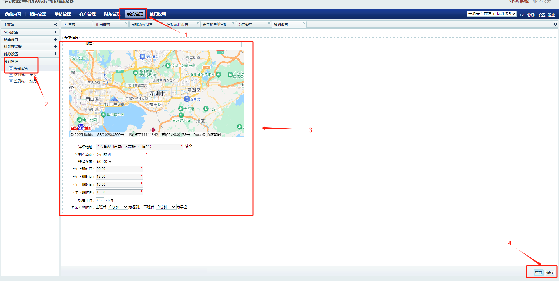 操作:在搜索栏,搜索到自己的公司名称或地址,地图上会显示小红点图标,点击小红点图标,详细地址就会自动生成,误差范围、上班时间、下班时间、标准工时、异常考勤时间,根据贵司的制度填写就可以,点击保存。