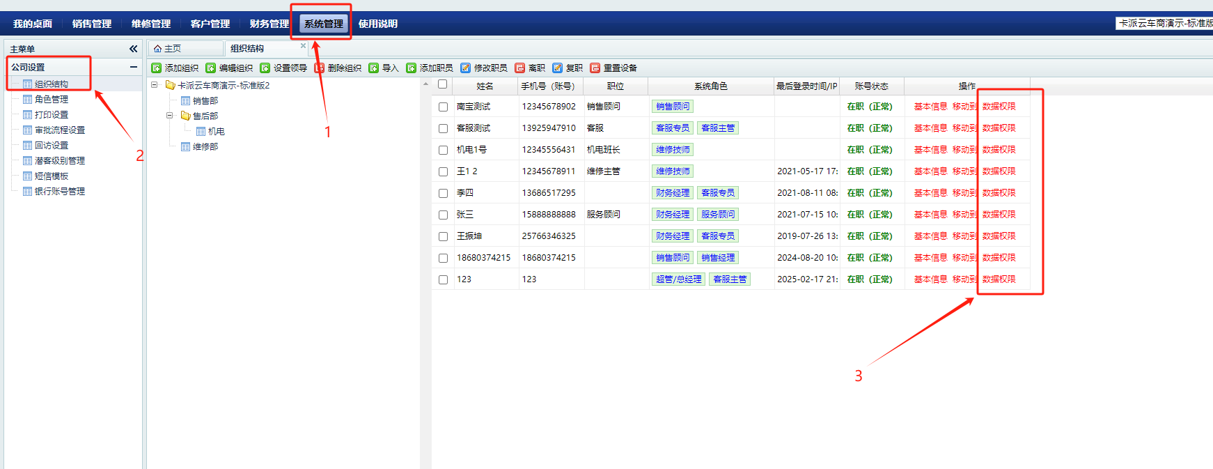 功能:每个职员都有自己可以查看数据范围的权限,有的人可以看自己的数据,有的人除了看自己的数据以外还需要看其它人的数据,例如销售顾问可以看自己的数据,销售组长可以看组员的数据,销售经理可以看销售部的数据。