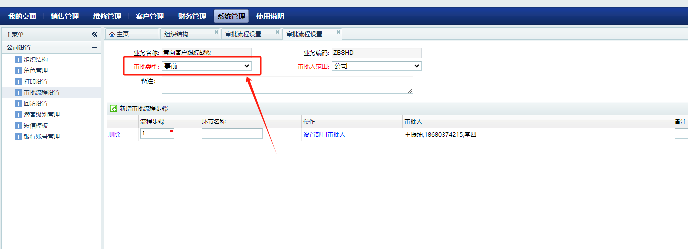 功能:战败的客户以及订单客户等都可以设置审批流程,来规范管理,具体操作如下: