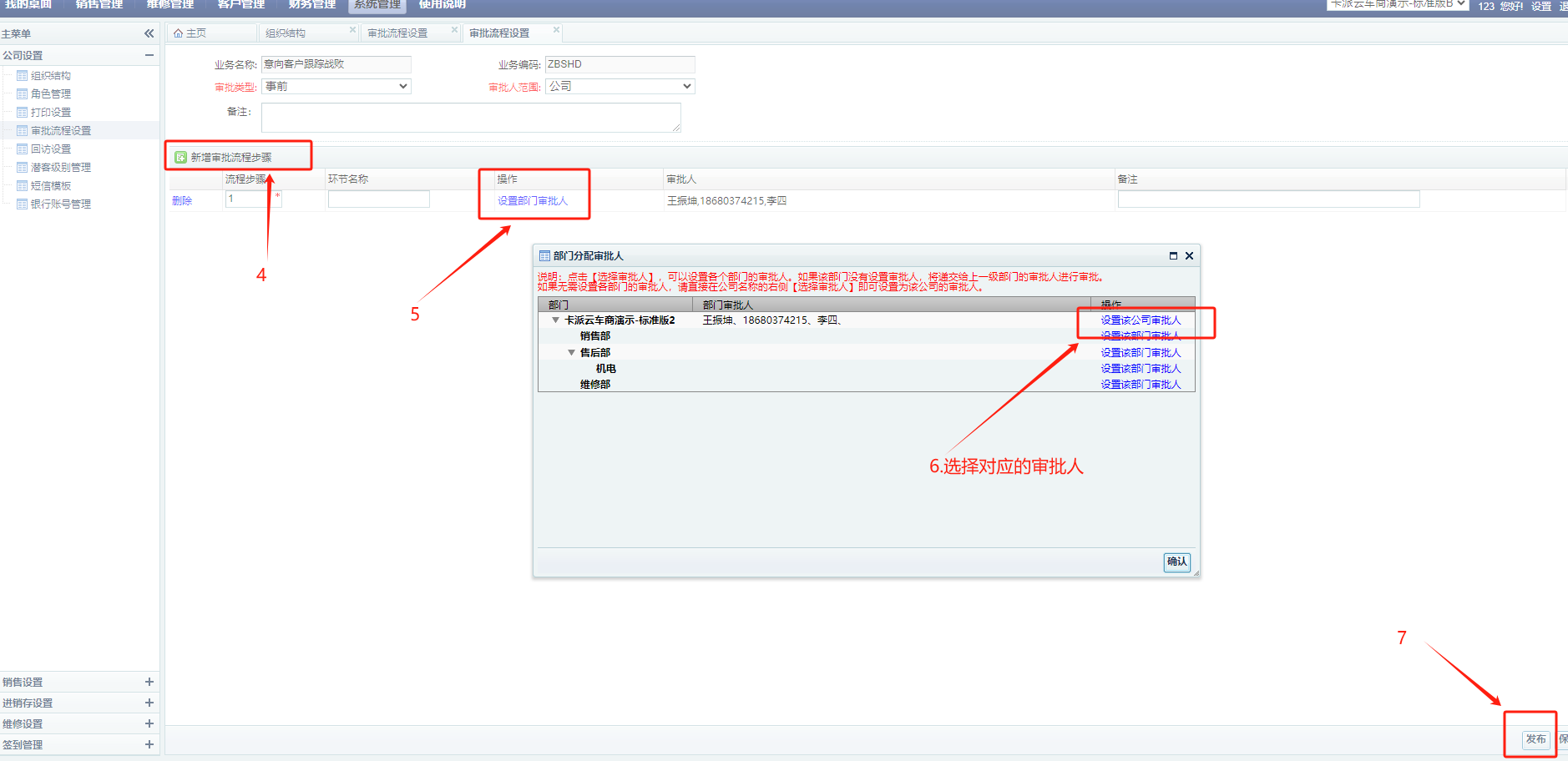 操作:在右边的列表里找到“意向客户跟踪战败”,点击它前方的“设置流程”按钮,在弹开的页面上点击“新增审批流程步骤”,点击“设置部门审批人”,在弹开的页面上找到最上方第一个“设置该公司审批人”,然后在弹开的人员组织中选择人员(此处人员可以多选),选择好后,点击“确认”,再点击右下角的“发布”。