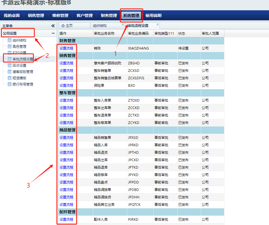 注意事项:为了保证系统的正常使用,精间版必须配置的流程有:意向客户跟踪战败、整车销售单;其它的流程可以在用到此处功能的时候再进行配置。