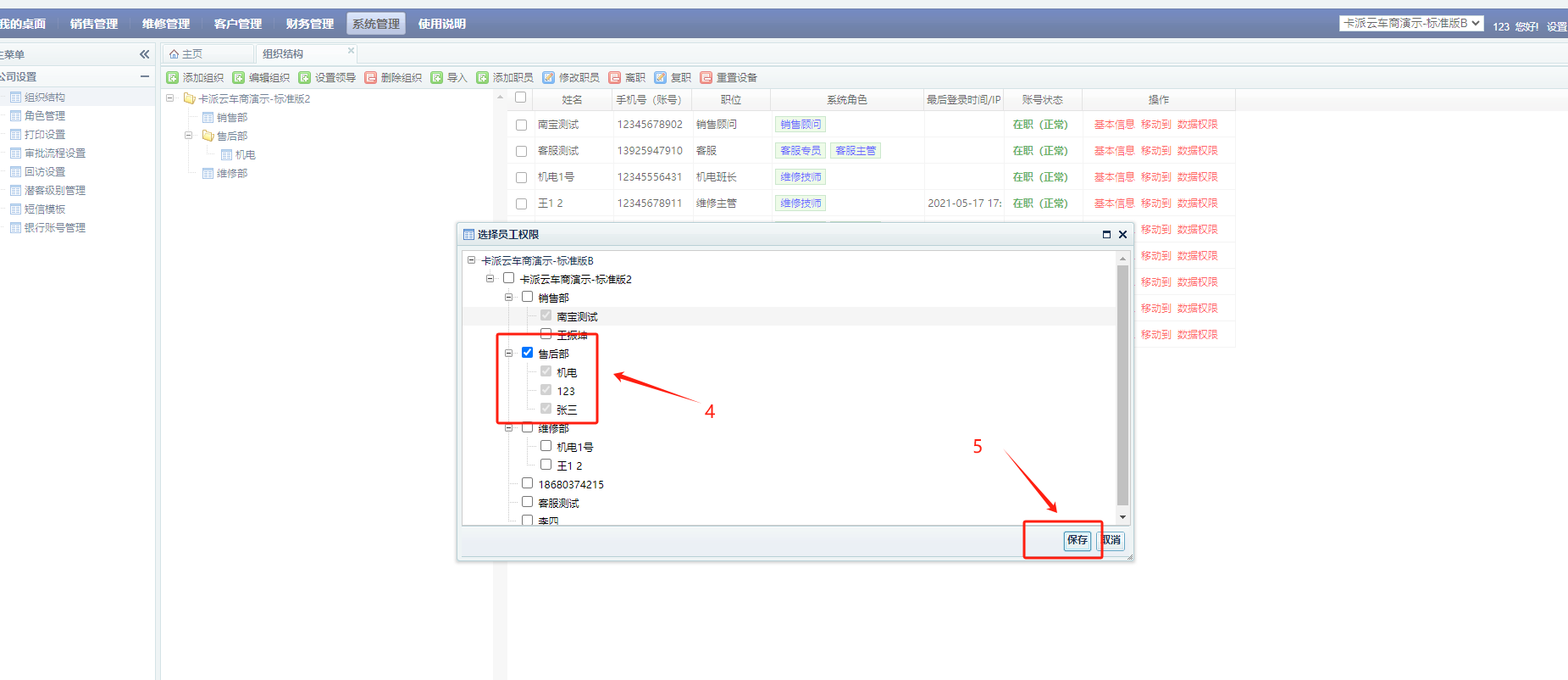 操作:在新建好的人员姓名最右边,找到“数据权限”的按钮,在弹开的页面上勾选此员工需要查看哪些同事的数据,如果是销售经理,建议在销售部的左边框里打勾,总经理在左边的公司名称上打勾。选择好后点击“保存”按钮。