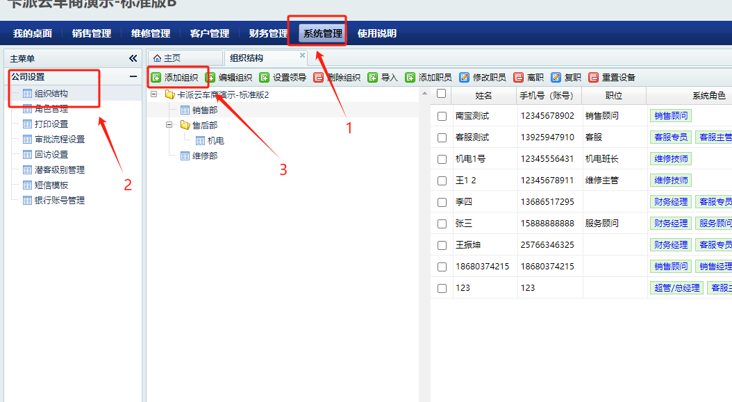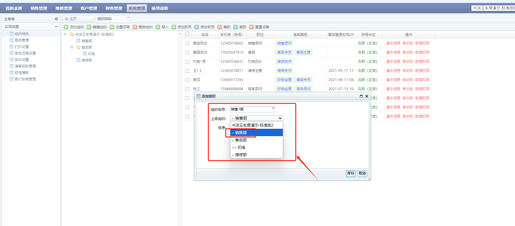 操作:点击上方菜单栏的“添加组织”按钮,在弹开的页面上输入“销售部”或者XX销售组,填定完成后点击“保存”按钮。