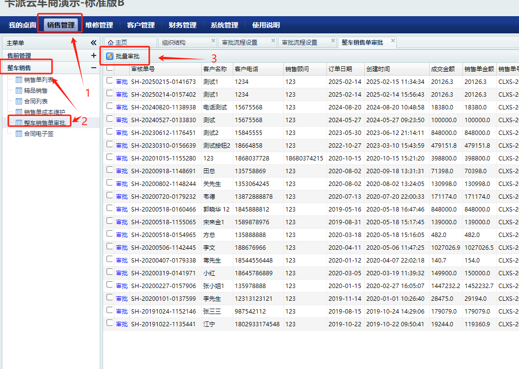 如离职人员有未审批的单据,需要先完成审批后,才可点离职;例如:整车销售单审批单据,需要在“整车销售单审批”菜单下找到这些单据,点击“批量审批”;每个职员待审批的任务不同,需要找到对应的审批单,点击“批量审批”