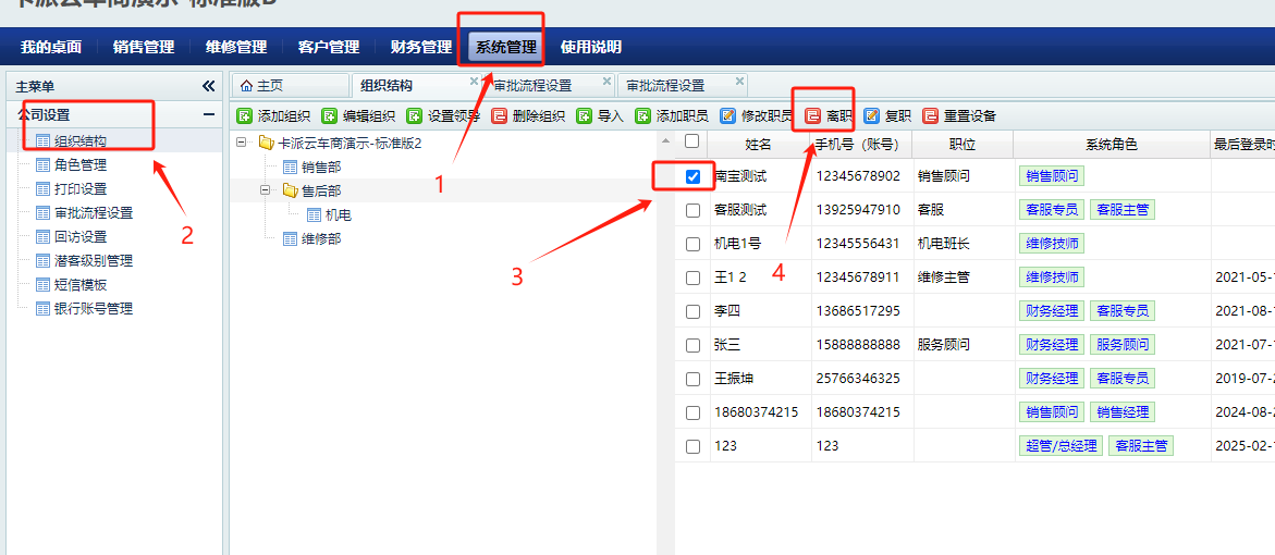 注:如提示有客户未分配不能离职参考:如何分配客户,当此职员名下没有客户时才可离职成功。离职人员不占用系统使用名额。