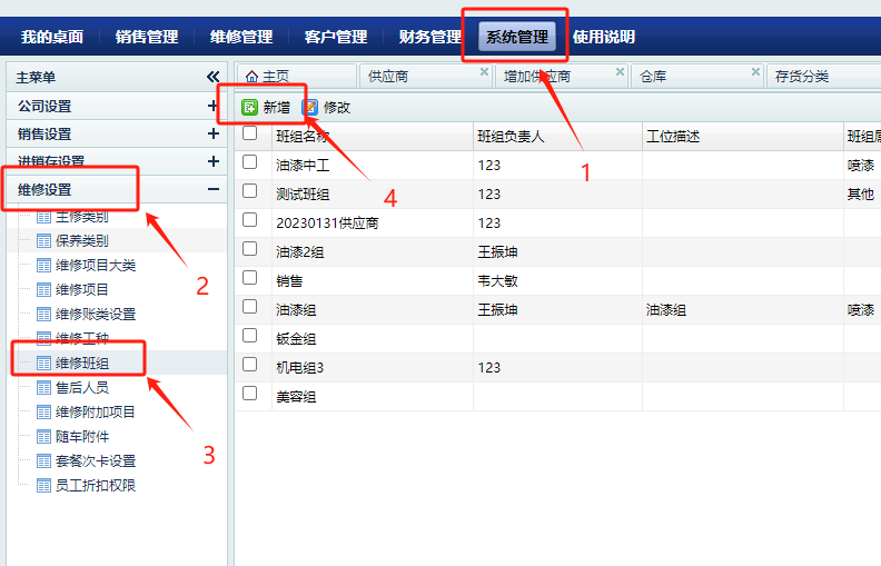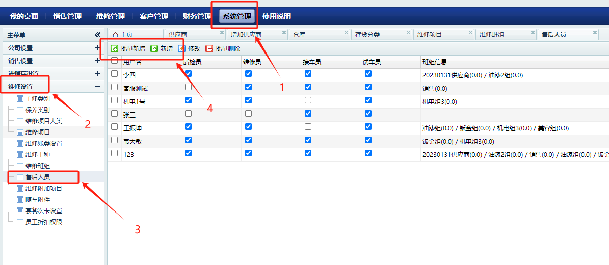 备注:这里需要注意的是,是否为质检员、接车员、试车员以及上方是否属于此班组是必须要勾选的。