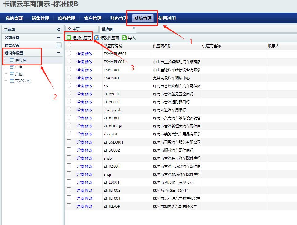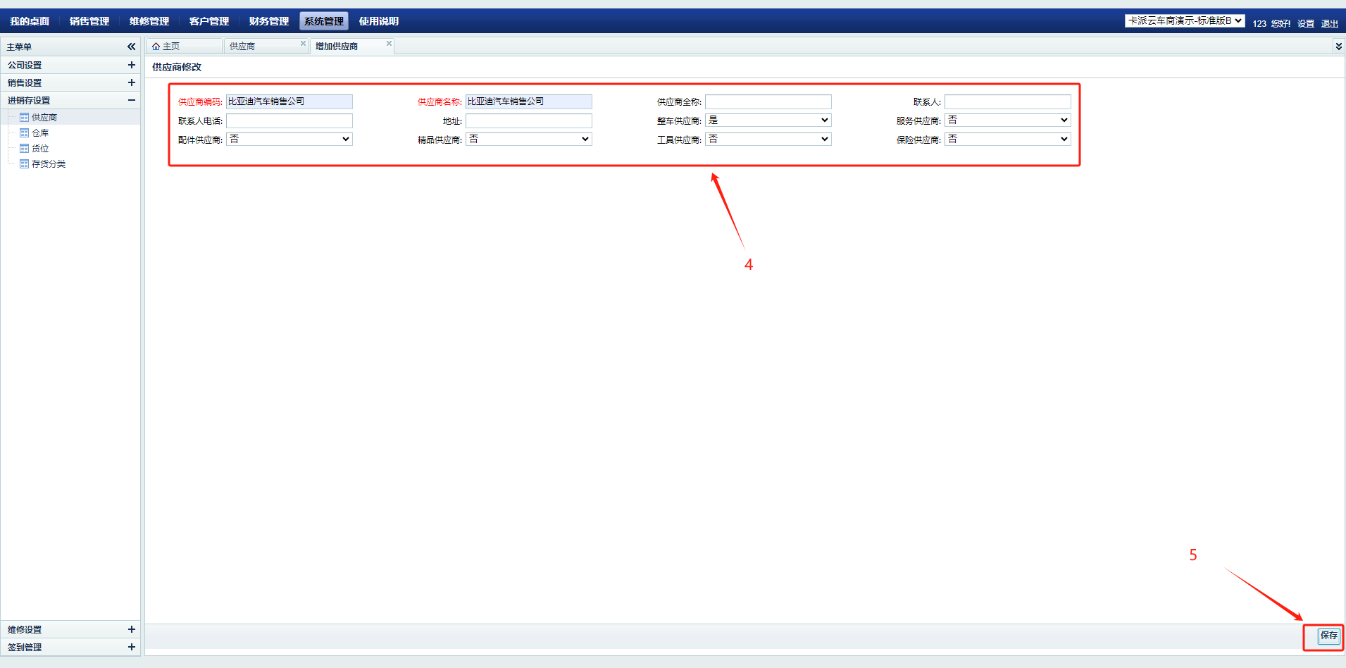 操作:点击列表上方的【增加供应商】按钮,进入编辑页面填写完信息后点击下方的【保存】,这里需要注意的是,不同类型的供应商在是否为某某供商应那里必须要选择是,否则会不生效(例如新增了一个保险供应商,在保险供应商下拉菜单中要选择是,再点击保存)。