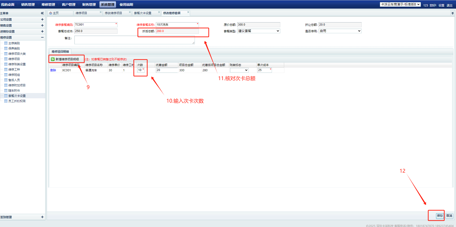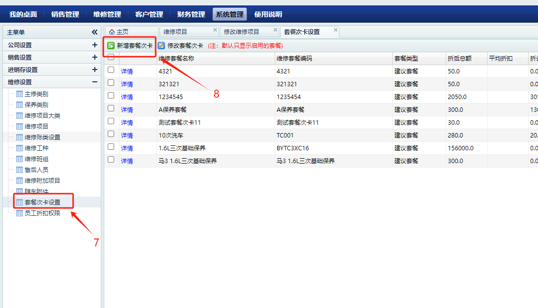 套餐次卡可以单独销售,也可以在整车销售单中赠送或者销售