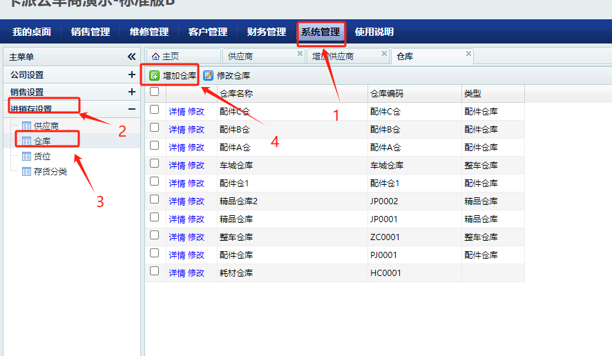 操作:点击列表上方的【增加仓库】按钮,进入编辑页面填写完信息后点击下方的【保存】
