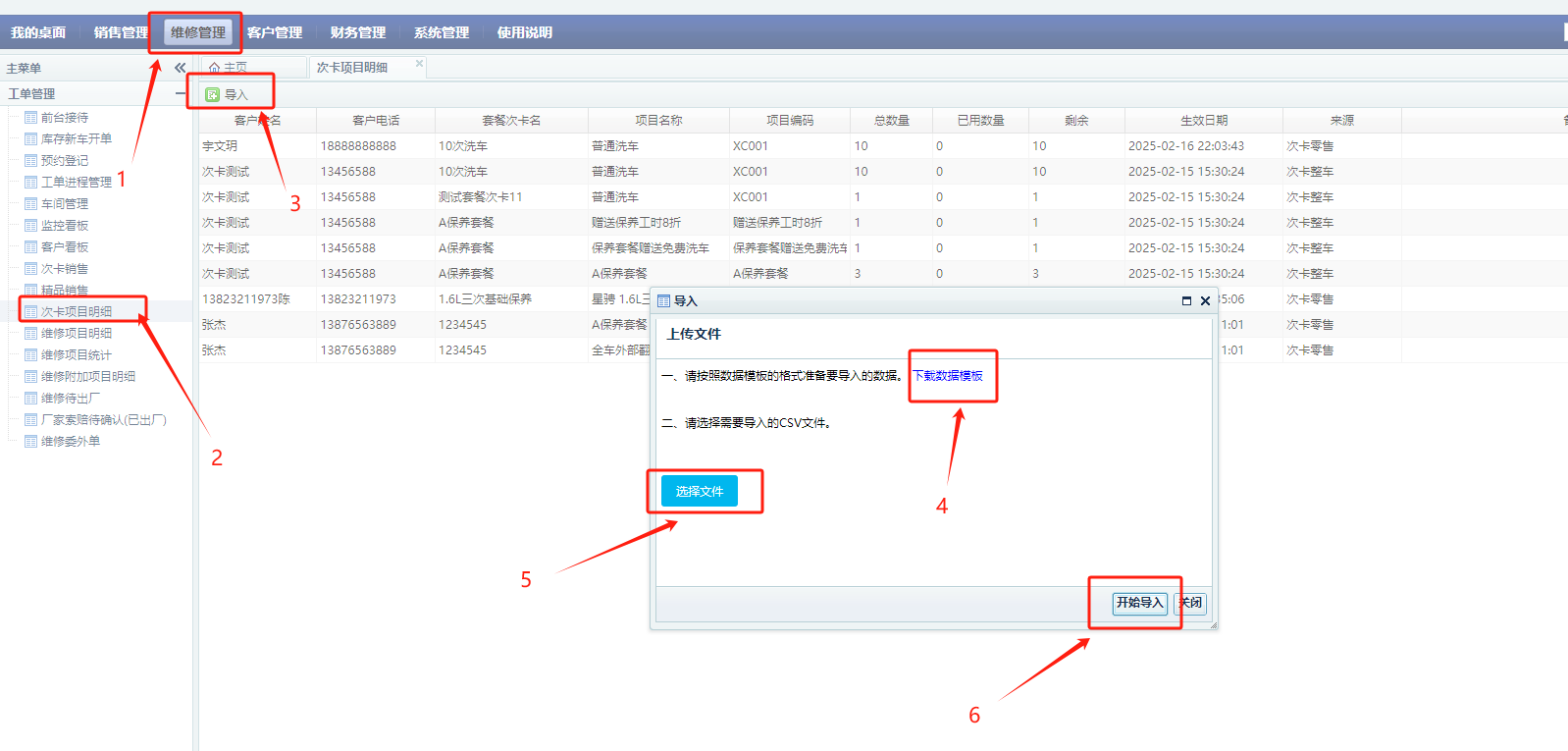 操作:点击列表上方的“导入”按钮,先点下载模板,再按模板所对应的列整理好数据后,选择文件,点击导入