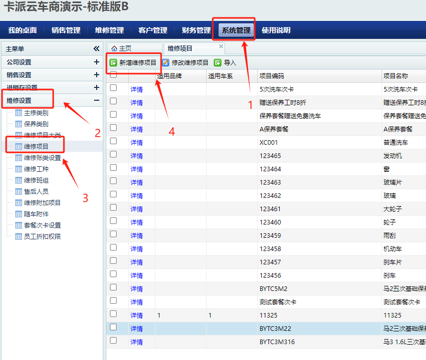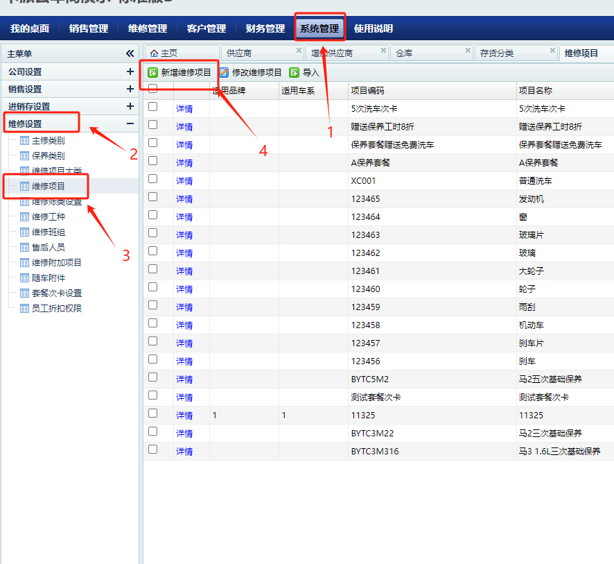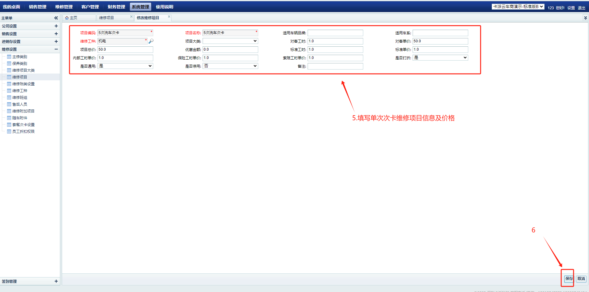 操作:点击列表上方的【新增维修项目】按钮,进入编辑页面填写完信息后点击下方的【保存】