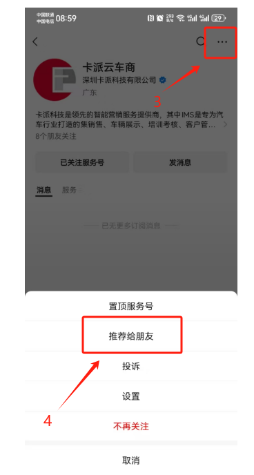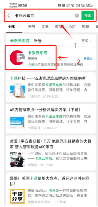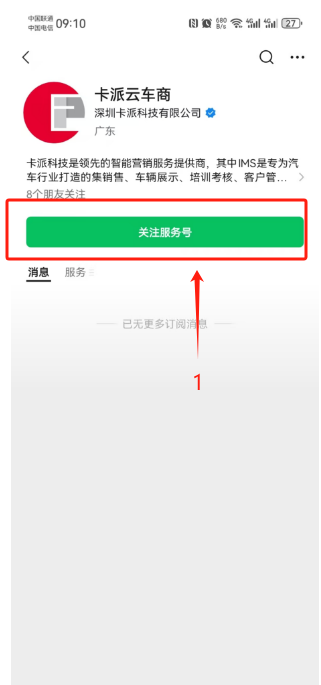 ▲客户通过销售顾问或者服务顾问分享的二维码或者搜索经销商的微信公众号,然后进行关注