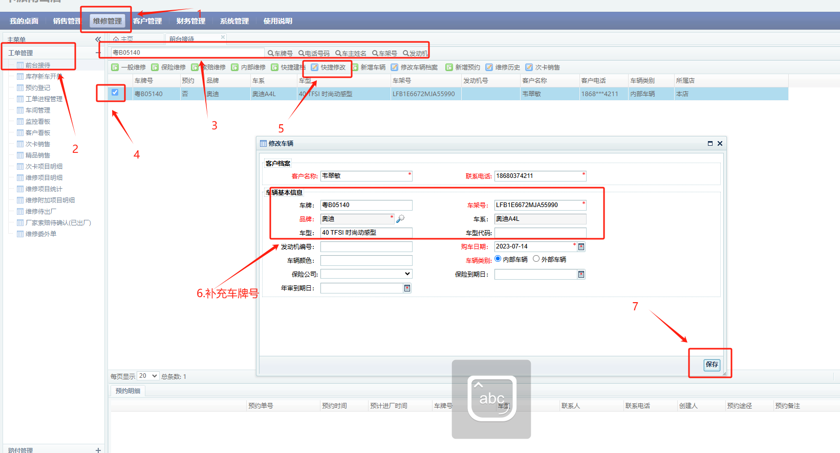 客户交车后系统当中已经有了保有客户车辆档案,但还没有车牌号,无法注册新会员也无法绑定,这时候可以在系统中找到保有客户车辆档案,点击修改按钮,先录入客户的临牌信息,会员绑定时输入临时车牌绑定,等拿到正式牌照后,再去系统当中修改车牌号即可。