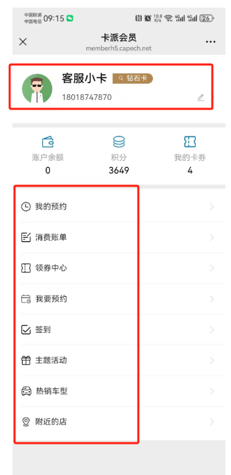 ● 注册或绑定成为会员后,点击菜单进入可查看会员信息、自主领券、查看公司活动等
