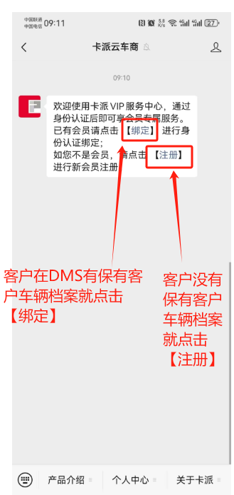 在DMS中已经有保有客户档案的车主,点击“绑定”操作,系统会自动关联DMS中的客户车辆档信息,如果DMS中没有客户档案,则点击“注册”操作