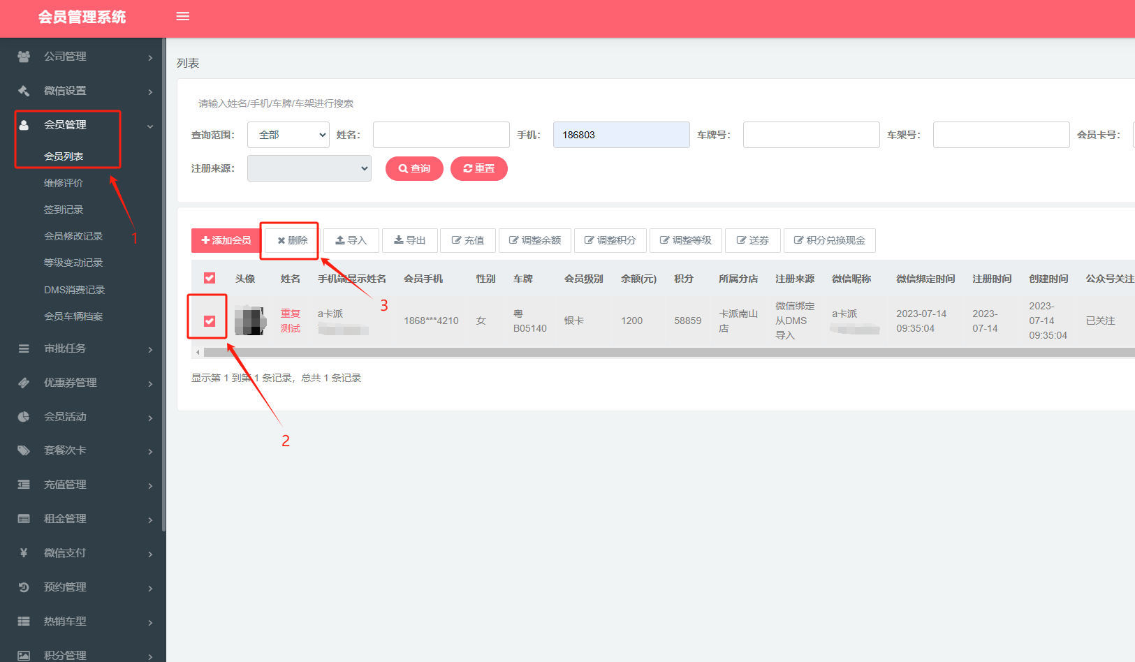 当客户有两个手机号,用A手机号注册成为会员之后,发现B手机号才是DMS中客户档案的手机号,这时需要找到系统管理员登录会员系统后台,在会员列表下搜索A手机号,找到此会员删除会员档案,(注意:删除会员会连同会员积分、优惠券、余额等信息一并删除)删除会员档案之后,再让客户用B手机号进行绑定会员。